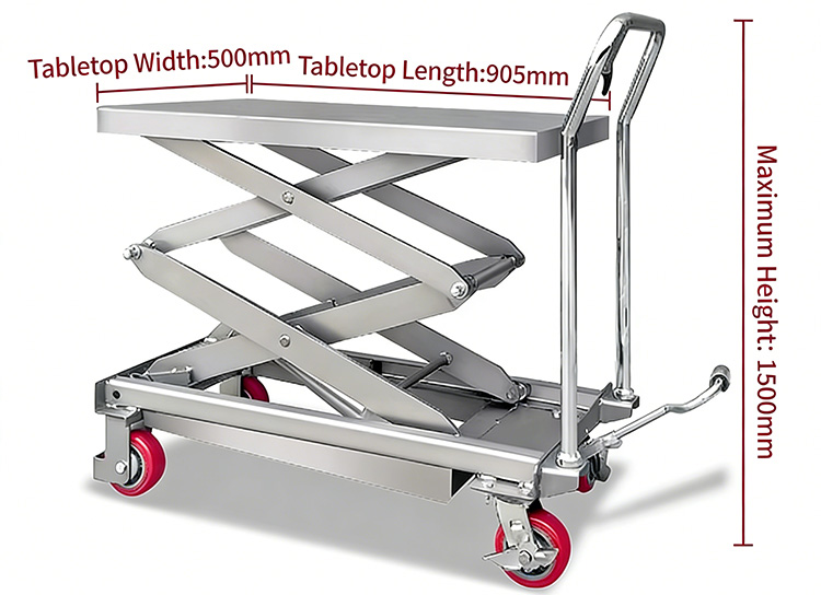 Hebei Shengyu's 350 kg rustfri stål hydrauliske løfteplatformstruck er lavet af rustfrit stål, der tilbyder overordnet korrosions- og rustbestandighed, fleksibilitet, sikkerhed, robusthed og holdbarhed.
